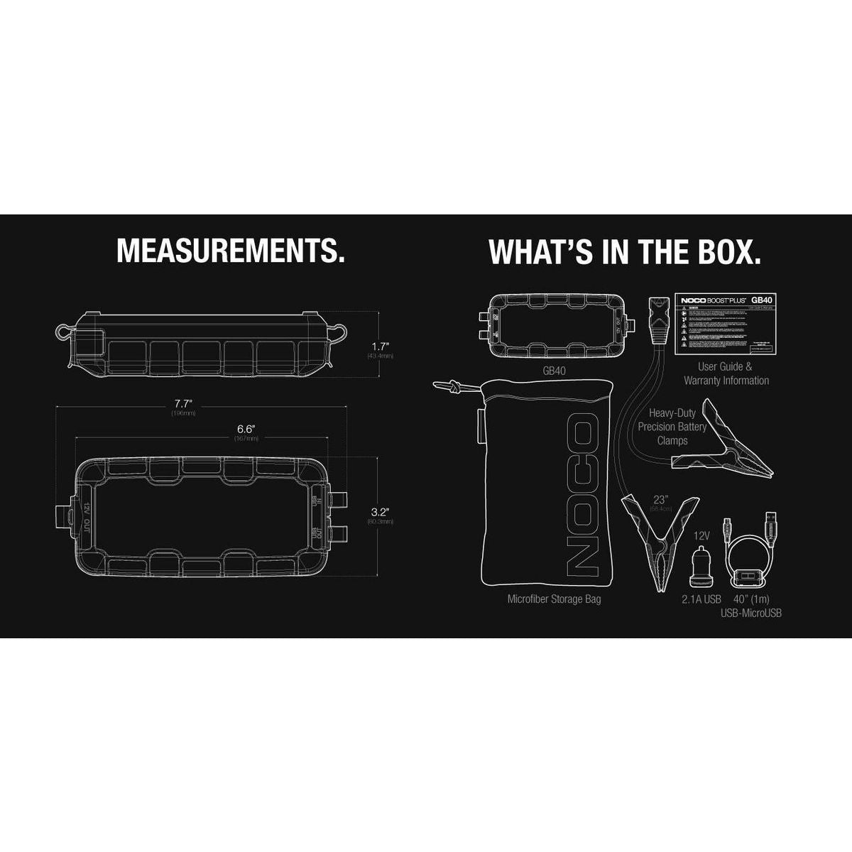 The GB40 is a portable lithium-ion battery jump starter pack with 1,000 amps of power that can jump start a dead battery in seconds. It has unique safety technology that provides spark-proof connections and reverse polarity protection, making it safe and simple to use for everyone.It's a powerful battery booster that also functions as a portable power supply for charging USB devices like smartphones and tablets. Petrol engines up to 6 litres and diesel engines up to 3 litres are designed for a car, boat, RV, truck, and other vehicles.