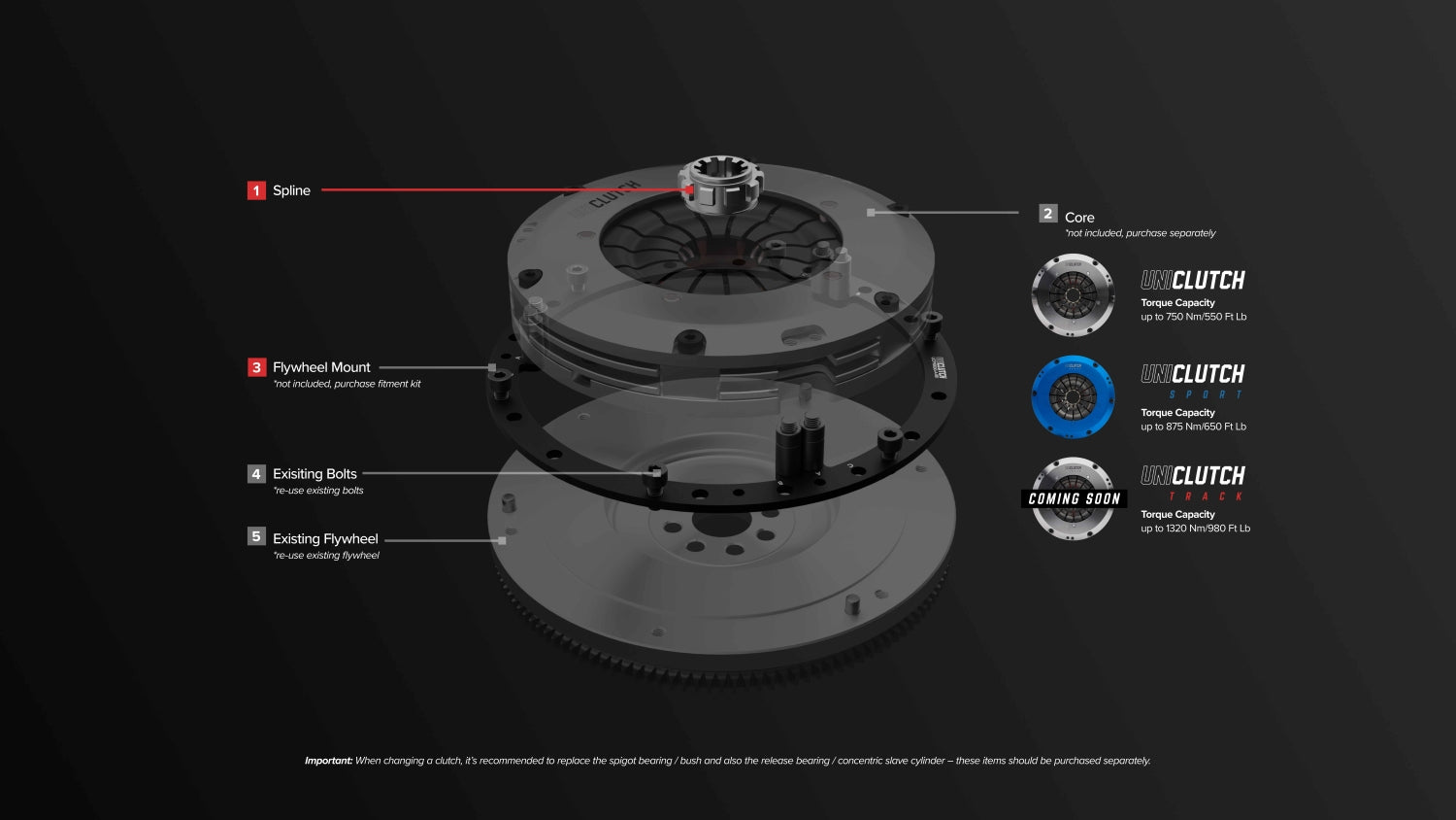 UniClutch is a breakthrough new clutch system designed and built in Australia that incorporates numerous new patented technologies that eliminate the various trade-offs associated with clutch upgrades - in fact, it's the ultimate clutch for whatever 4WD you drive and however you want to drive it. Engineered to stringent standards, the Twin Disc sealed UniClutch may be fitted in a fraction of the time of a typical clutch because the customer's factory flywheel does not require machining. A UniClutch Fitment kit is designed to allow you to install a UniClutch Core (sold separately) into your 4WD.